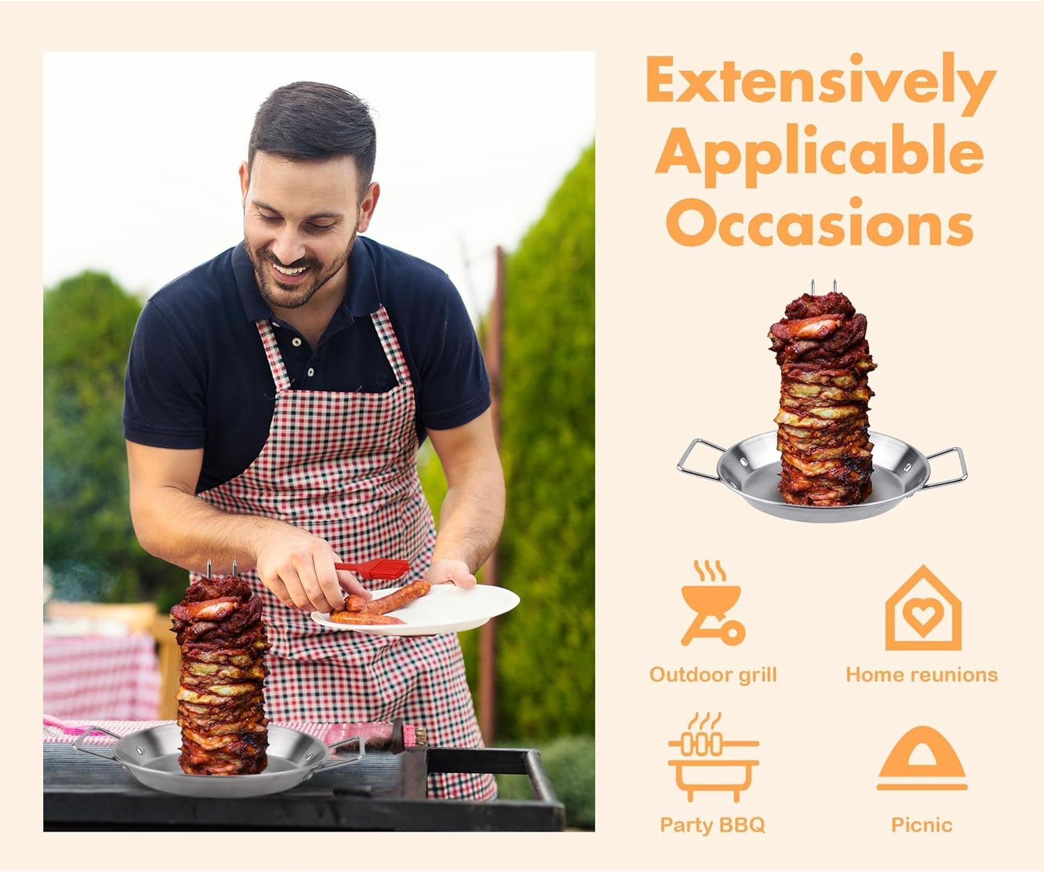 - Widely used: our Al pastor rotating grill is ideal for making tacos, shawarma, and gyros at home; with our vertical skewer, you can create restaurant-style gyros, Al pastor, shawarma, doner kebabs, kebabs, whole chicken, fish, and even Brazilian Churrascaria dishes using your oven or regular grill at home; you can prepare delicious meats without the need for a rotisserie