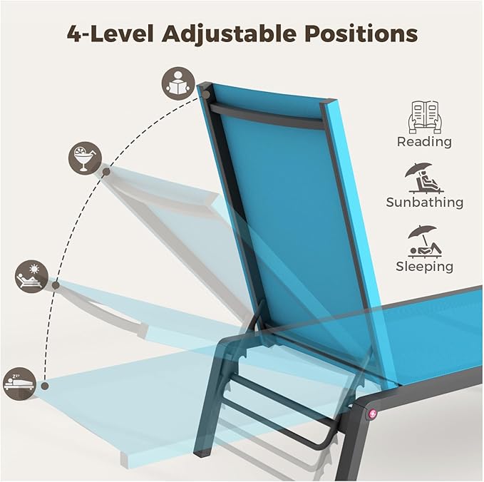 - 【4 LEVEL BACK REST】: This chaise lounge chair outdoor has a 4-position adjustable backrest. This patio lounge chair set of 2 can be reclined flat, with your body fully supported by the recliner, providing you with tailor-made comfort.