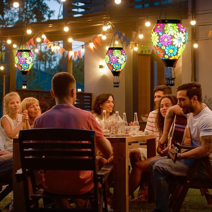 - 【Mosaic Hot Air Balloon Solar Lantern】Brand-new mosaic pattern design. This outdoor hanging solar lanterns 's surface is with a multitude of colorful glass pieces meticulously arranged to form an array of captivating floral patterns that cover its surface. When the outdoor solar lantern is lit, the flashing flame lamp make it more like a hot air balloon that is rising, creating a stunning visual effect, and also placing our good wishes to give people warmth.