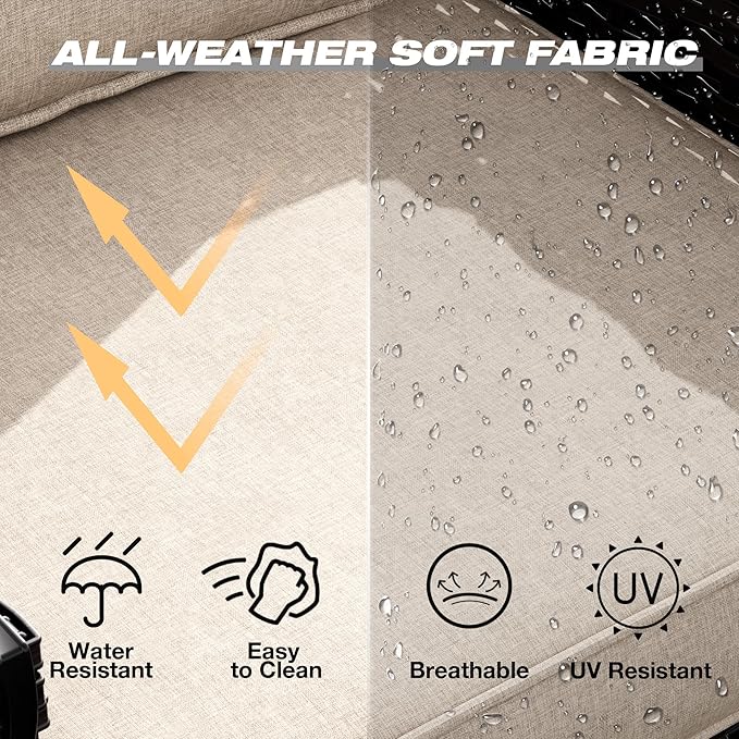 - Comfy Thick Cushion: Upgraded cushions are all made of high density sponge with 4 inches, thick sponge seat cushions and soft back cushions gives you comfortable support. The cushion cover is made from olefin fabric, which is breathable, UV-resistant, and waterproof. It features a zipper on the side for easy removal and cleaning