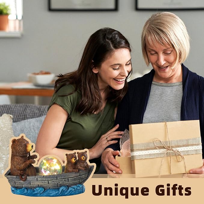 - Mother and Baby Bear Boating Statue:A mother bear rowing a boat,her two children on the other side,with a ball light in the middle,this image is so realistic and cute that it overflows with a warm and caring atmosphere.Day or night,this solar statue will be a beautiful addition to any indoor or outdoor space.