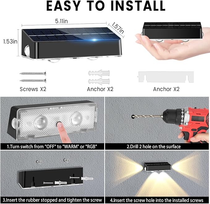 - Easy install& Widely Used: Our solar deck fence lights can be mounted with screws on outdoor walls, fences, next to the porch, or can be directly affixed with 3m adhesive,easy to install and saves labor costs;It's recommended for wooden fences, wall, driveway,decks, porches, patios, garage doors, gardens, villas, steps, fences, passages, stairs, flowerbed, terrace, sidewalk,balcony, yard, front door, gate, staircases, railing,house,posts and pathway etc
