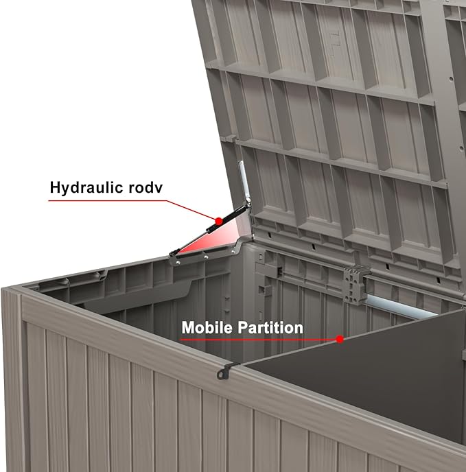 - Hydraulic Support for Easy Lid Opening:Equipped with hydraulic support, this deck box lid opens smoothly and stays open, providing easy access to your stored items. No need to struggle with heavy lids anymore.