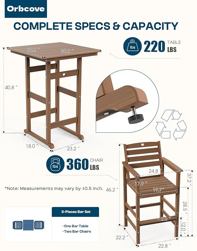 - Durable All-Weather Design: (Please note!!!Your order consists of two or three separate packages, which may be delivered at different times.) Crafted from HDPE with a natural wood grain finish, Orbcove bar table and chairs set withstands sun, rain, and wind without fading or cracking. Ideal for deck furniture, backyard furniture, or porch furniture, it’s perfect for year-round outdoor living.