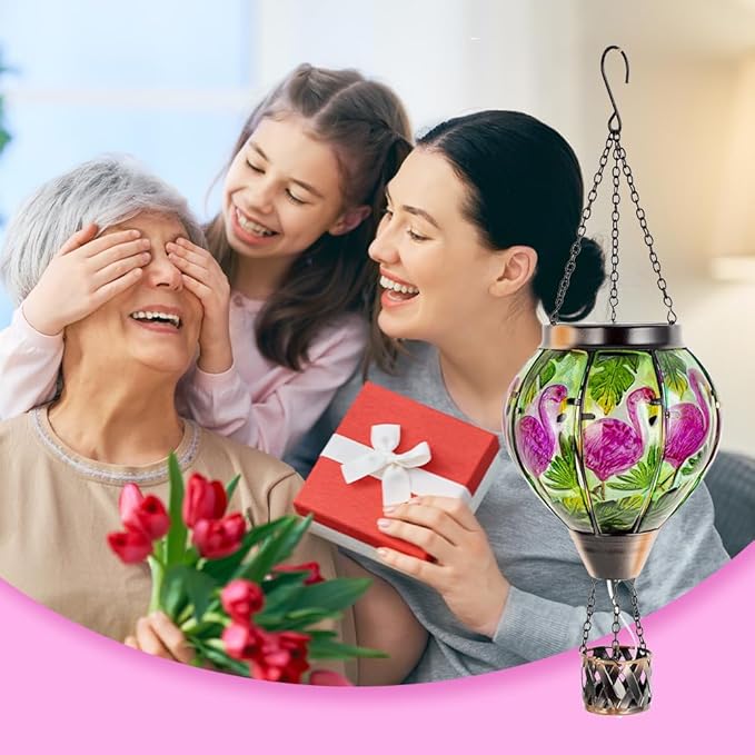 Flamingo Solar Hot Air Balloon Flickering Flame Hanging Garden Light,Glass Hot Air Balloon Solar Lanterns Outdoor Waterproof for Patio Tree Yard Decor,Flamingo Lantern Birthday Gifts for Women