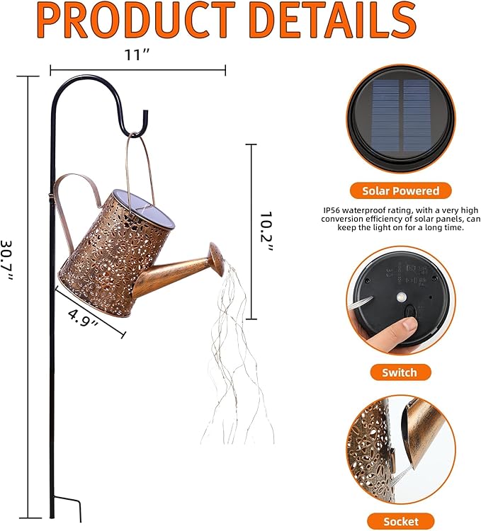 - 【Multiple Using Modes】Offering versatile usage, you can place this patio decor watering can on the ground or hang it using the included shepherd's hook. Choose between Steady and Streaming lighting modes for different atmospheres.
