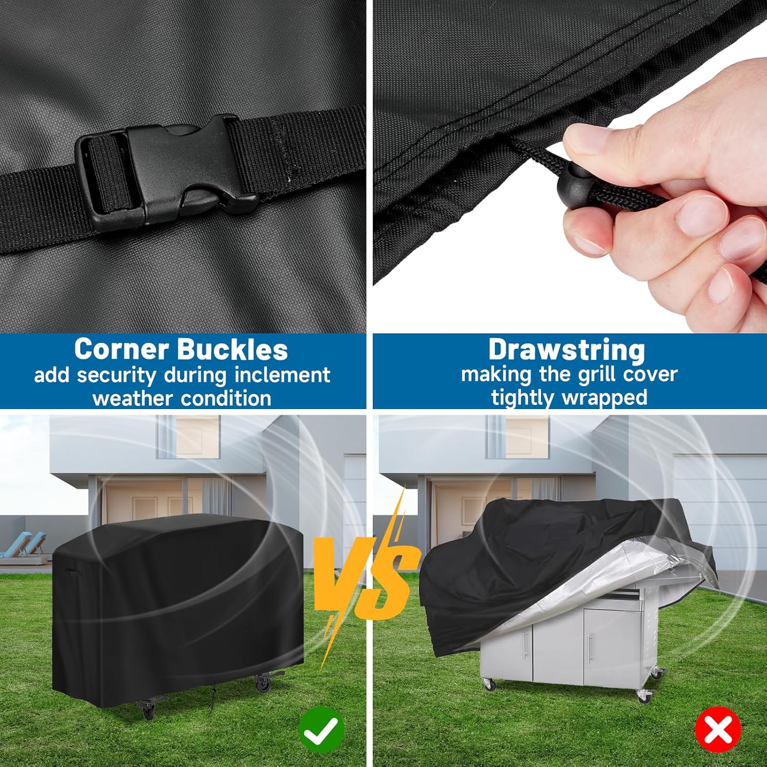 - Wind-Resistant Design: With with a bottom drawstring and four corner buckles, our flat grill cover prevent being blown off, even in strong winds. This feature enhances waterproof and ensures that your griddle is consistently protected.
