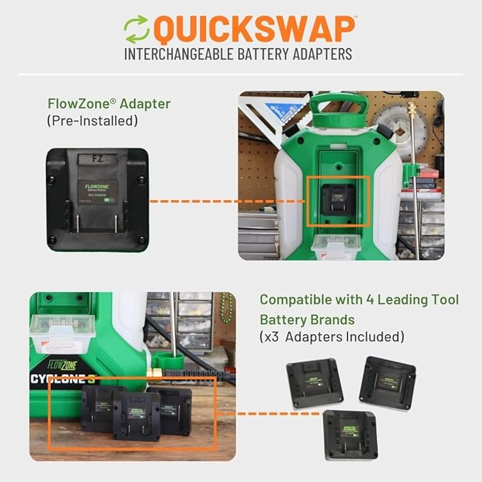 FlowZone Cyclone 3 Battery Powered Backpack Sprayer - Variable-Pressure 5-Position Electric Sprayer Compatible with FlowZone, De-Walt, Milwaukee, Makita, & Bosch Batteries (Battery Not Included)