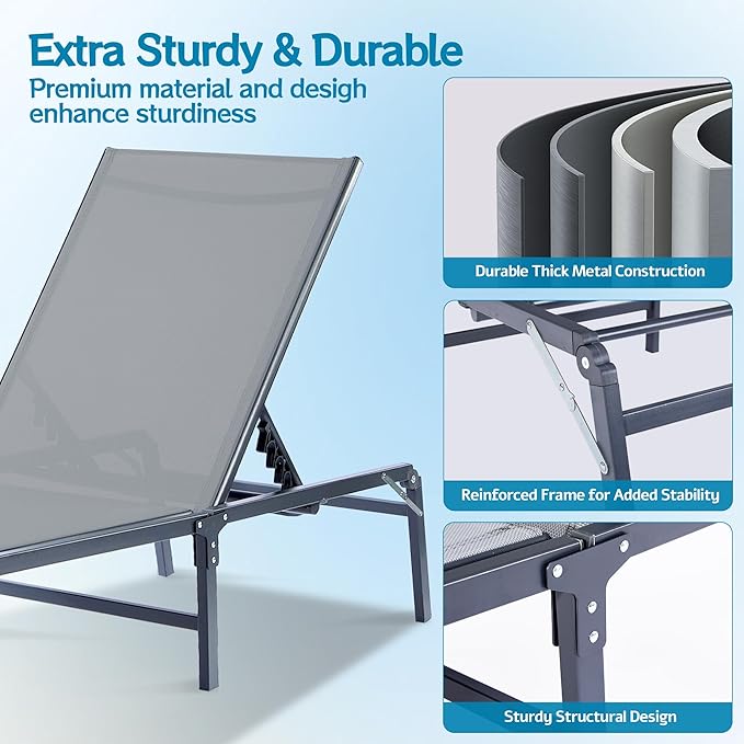 - Premium Comfort & Durability: This outdoor chaise lounge features high-quality, breathable Textilene fabric that is fade-resistant, water-resistant, and quick-drying. The ergonomic design ensures long-lasting comfort, while the fabric offers excellent support for ultimate relaxation.