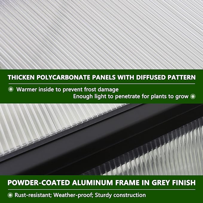 - 4MM Thickened Polycarbonate: Our greenhouses for outdoor are equipped with 4mm polycarbonate panels, the light transmittance is high, and the heat preservation effect is better than that of the same glass. which provides good conditions for plant growth. In addition, the temperature adaptability of the panel can be used at low temperatures and high temperatures without obvious change. Wear-resistant, light, and convenient for transportation and disassembly