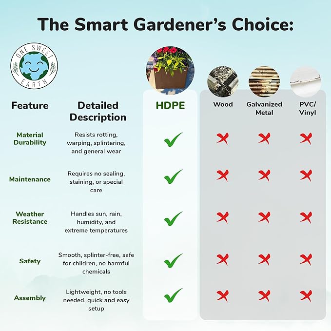 - SAFE, ECO-FRIENDLY GARDENING: Made from non-toxic, BPA-free plastic, this raised bed is 100% recyclable, offering a sustainable option for growing your herbs, vegetables, and flowers. Enjoy peace of mind knowing your garden is safe for both plants and the planet.