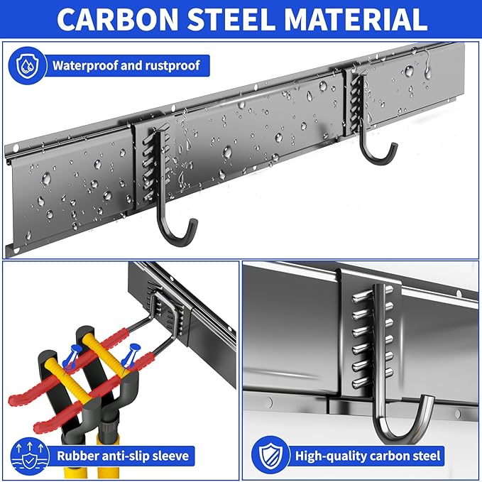 - HEAVY-DUTY 300 LBS CAPACITY: garage organizers and storage Constructed from premium steel with a rust-resistant, double powder-coated finish. Rubber-coated hooks prevent slipping. Built for long-lasting durability in your garage or garden