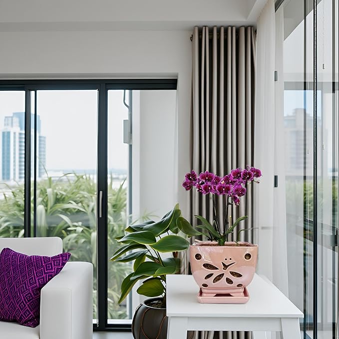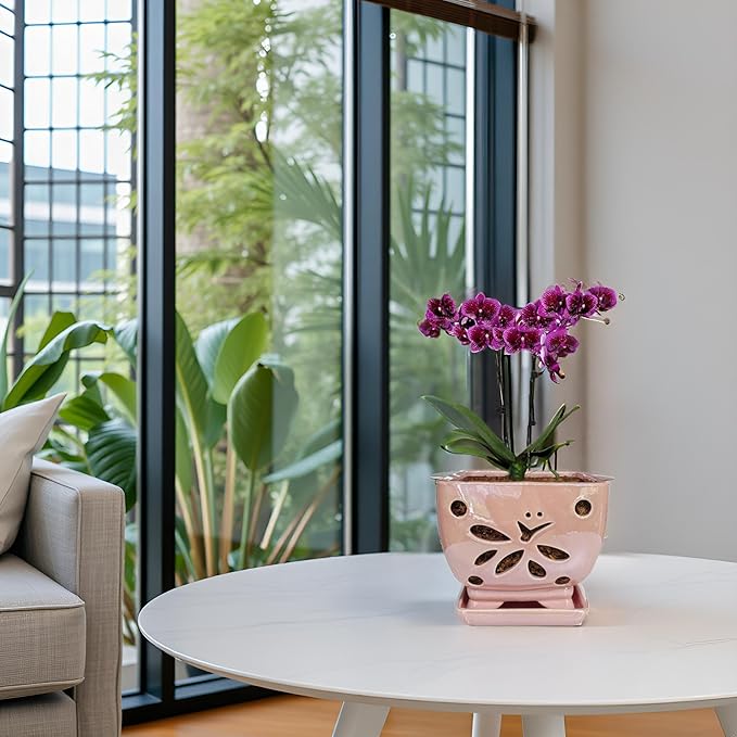 Orchid Pots with Holes Square Ceramic Orchid Planter Pots 5.5 inch (Pink)