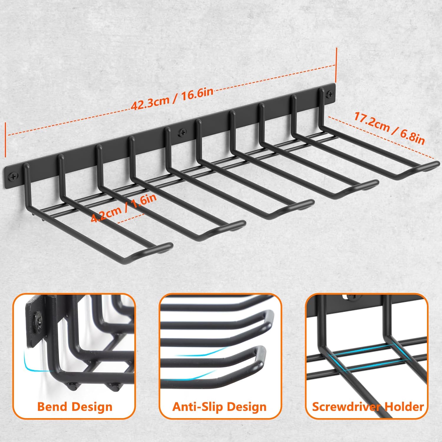 - Anti-Slip: The wire at the top of the power tool holder is designed with a 30° bend to prevent the the tool from slipping