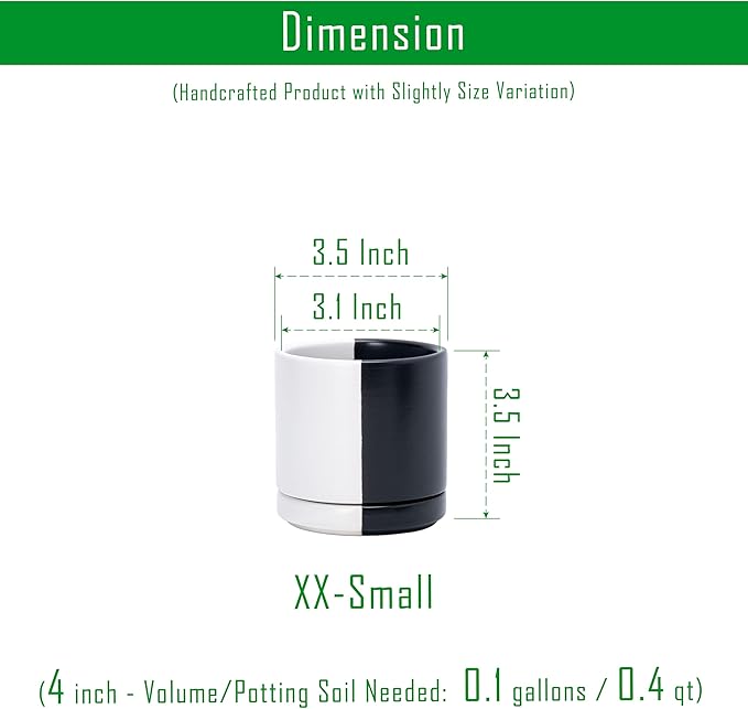 - Multiple Size Options: Available in six sizes (3.5" to 11.8") to fit plants of all types, from small succulents to larger houseplants. XX-Small 3.5 Inch Planter Pot: 3.5" Diameter x 3.5" H, Potting Soil Needed: 0.11 gallons / 0.45 qt.