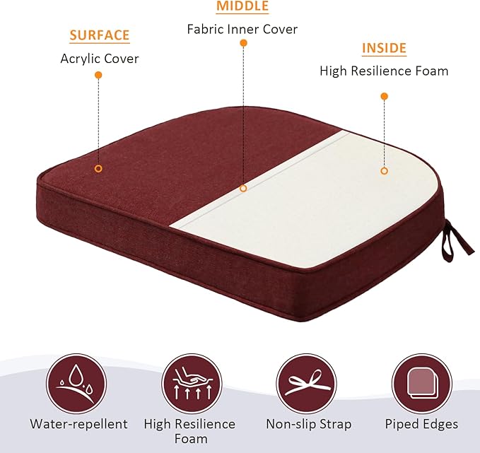 Sunbrella Round Corner Seat Cushions, 17" x 16" x 2", Set of 4, Indoor Outdoor Water Repellent Universal Chair Pads with Ties for Patio Furniture, Garden Dining Chairs, Spectrum Brick