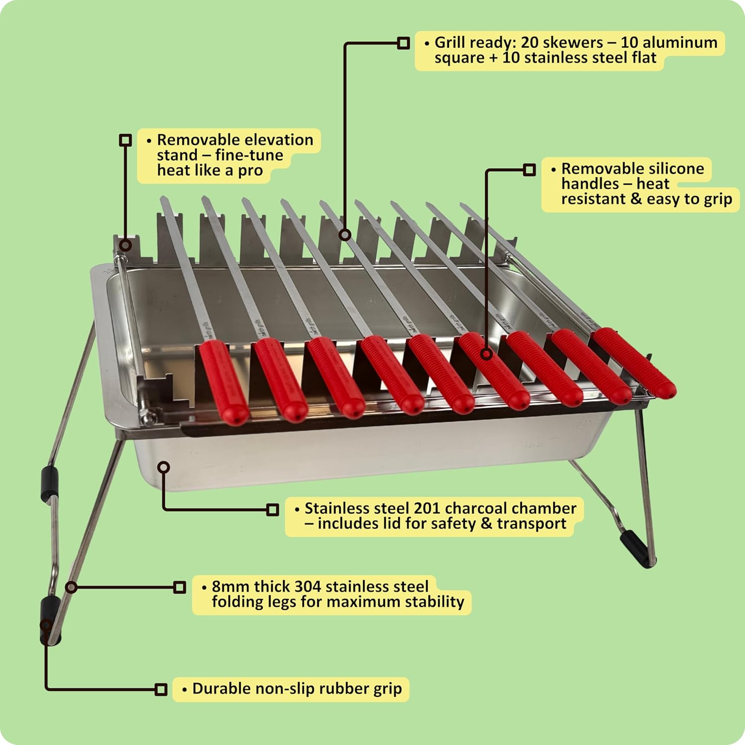 ๐๐ต๐ฎ๐ฟ๐ฐ๐ผ๐ฎ๐น ๐๐ฎ๐ฏ๐ผ๐ฏ ๐๐ฟ๐ถ๐น๐น by ๐ก๐ผ๐ฟ๐๐ต ๐๐ฟ๐ถ๐น๐น๐: precise heat control, silicone-handle square & flat skewers, charcoal starter tool, tongs, BBQ gloves, and storage & travel bags.