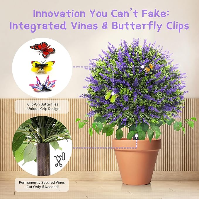 • 【Exclusive Nature-Inspired Design】 Stand out with TONAHUTU 28" UV-resistant faux topiary, the ONLY fake lavender plants featuring lifelike faux vines and delicate fake butterfly ornaments. Crafted with premium silk foliage and reinforced polyethylene stems, this realistic lavender boxwood artificial plants outdoor mimics natural textures while resisting fading for 5+ years in harsh sunlight