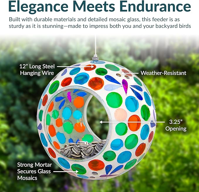 - ATTRACT BIRDS TO THE YARD: This cute bird feeder features vibrant colors and a mosaic glass construction that is sure to appeal to humans and birds alike. The bright colors and reflective material will help attract a variety of bird species to the feeder including cardinals, finches, sparrows, and more. Plus, it will add a stylish pop of color to any patio decor. The open fly-through design also makes it easier for birds to access the seed, encouraging them to come back again and again.
