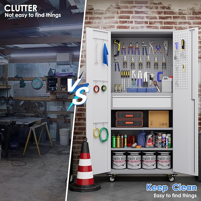 - Upgrade and Practical Design: This garage storage cabinet with wheels features the latest design and comes with a range of practical accessories to enhance storage space: pegboard, pegboard on side panels, 16 hooks; towel hangers ; 2 adjustable shelves; making it an ideal choice for storing tools, cleaning supplies, and everyday essentials;