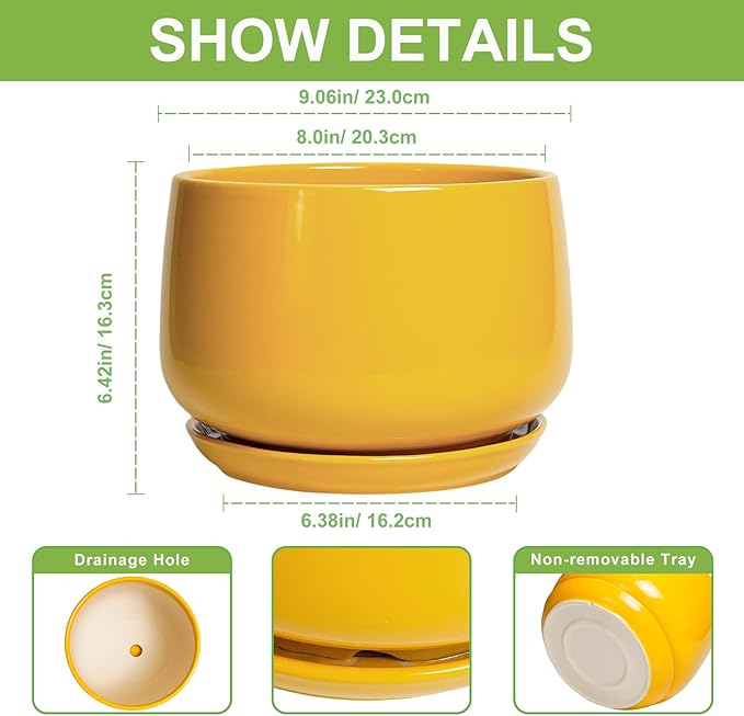 - Dimensions: These ceramic flower pots measures 9.06" x 9.06" x 6.42". This yellow planter is an ideal choice for growing olive tree, snake plant, money tree, monstera deliciosa, ZZ plants, geranium plant, pothos, peace lily, succulents, cacti, aloe vera, orchids, african violet, bonsai tree and other indoor & outdoor plants