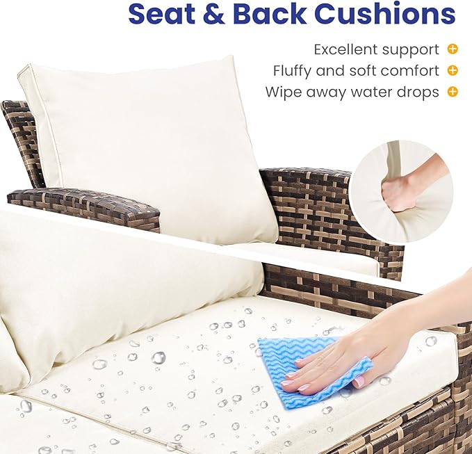 - Oversize Outdoor Patio Furniture Set:FHFO wicker patio furniture set with widened armrests,and curved backrest is ergonomically designed to bring comfort to the back. Wide and deep patio sofa cushioned by soft padded seat cushions will make you forget your fatigue and enjoy your leisure time completely