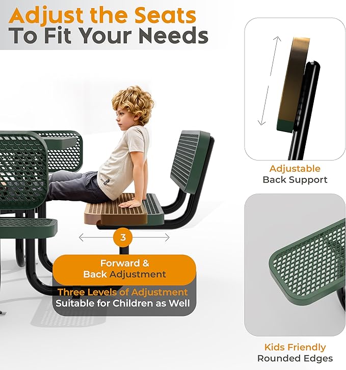 Metal Picnic Tables for Outdoors with Umbrella Hole - Coated Steel Heavy Duty Commercial Grade Table with Adjustable Seats (Green, 46 in, Square with Back, Expanded Steel)