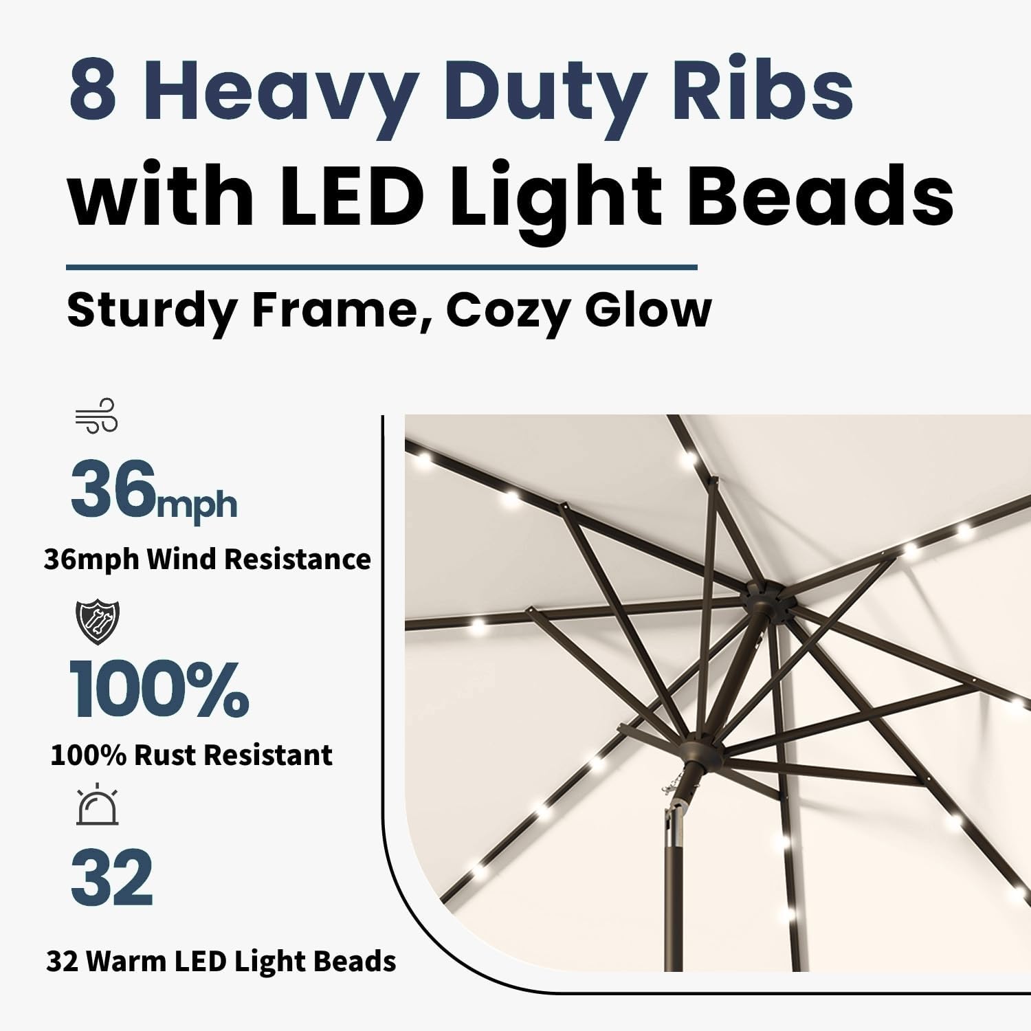 - 32 Solar-Powered LED Lights: Illuminate your evenings with 32 built-in LED lights powered by a high-efficiency solar panel, without the need for external power sources, providing up to 8 hours of ambient lighting.