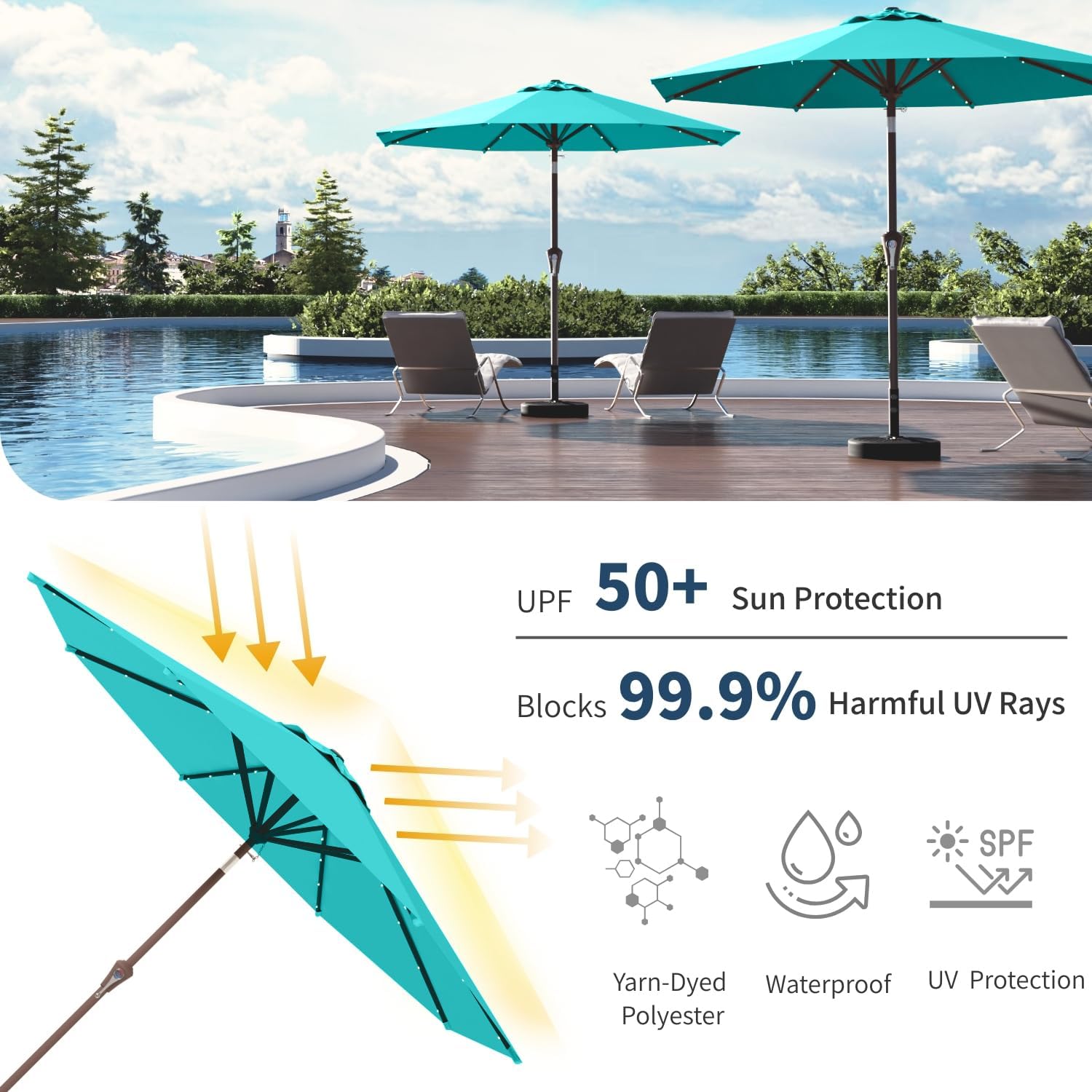 10FT Solar Umbrella 32 LED Lighted Patio Umbrella Table Market Umbrella w/Tilt and Crank, UV-Resistant Outdoor Umbrella for Pool, Garden, Deck, Aqua Blue