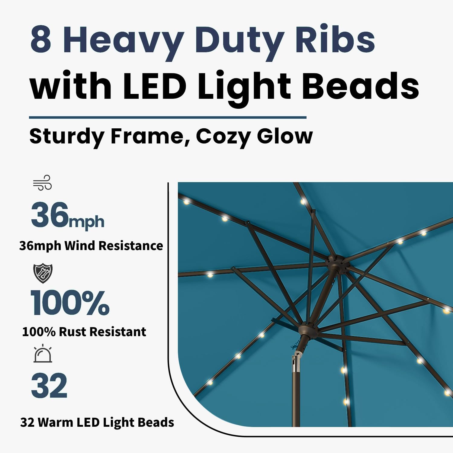 9FT Solar Umbrella 32 LED Lighted Patio Umbrella Table Market Umbrella w/Tilt and Crank, UV-Resistant Outdoor Umbrella for Pool, Garden, Deck, Lake Blue
