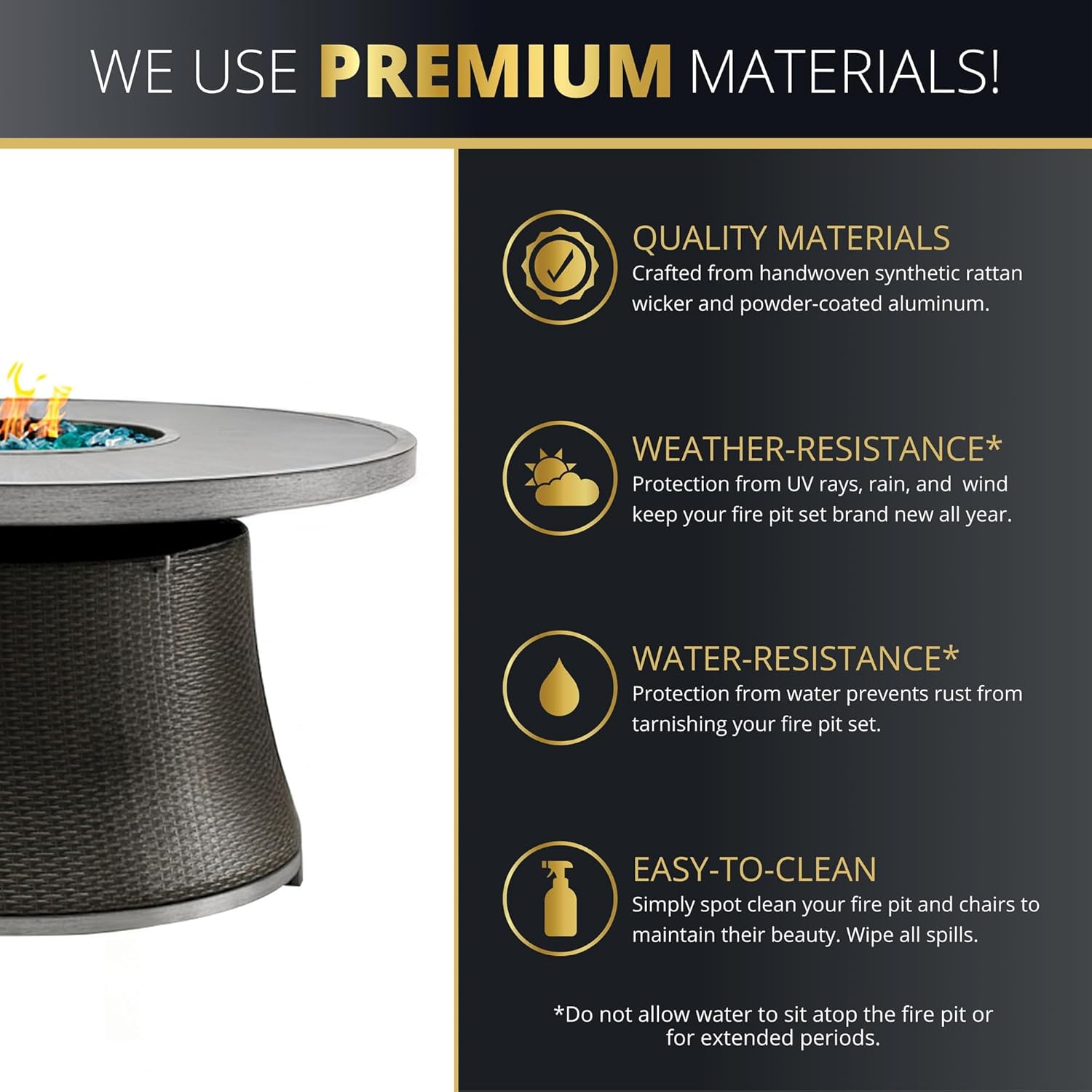 - 【Premium All-Weather Materials】Designed for durability, our aluminum patio furniture set features solid rust-proof aluminum frames and hand-woven fade-resistant resin wicker that withstands sun, rain, and changing weather conditions. The gas fire pit table and matching chairs maintain their elegance season after season. Backed by a 3-year limited warranty covering manufacturing and shipping defects for your peace of mind.