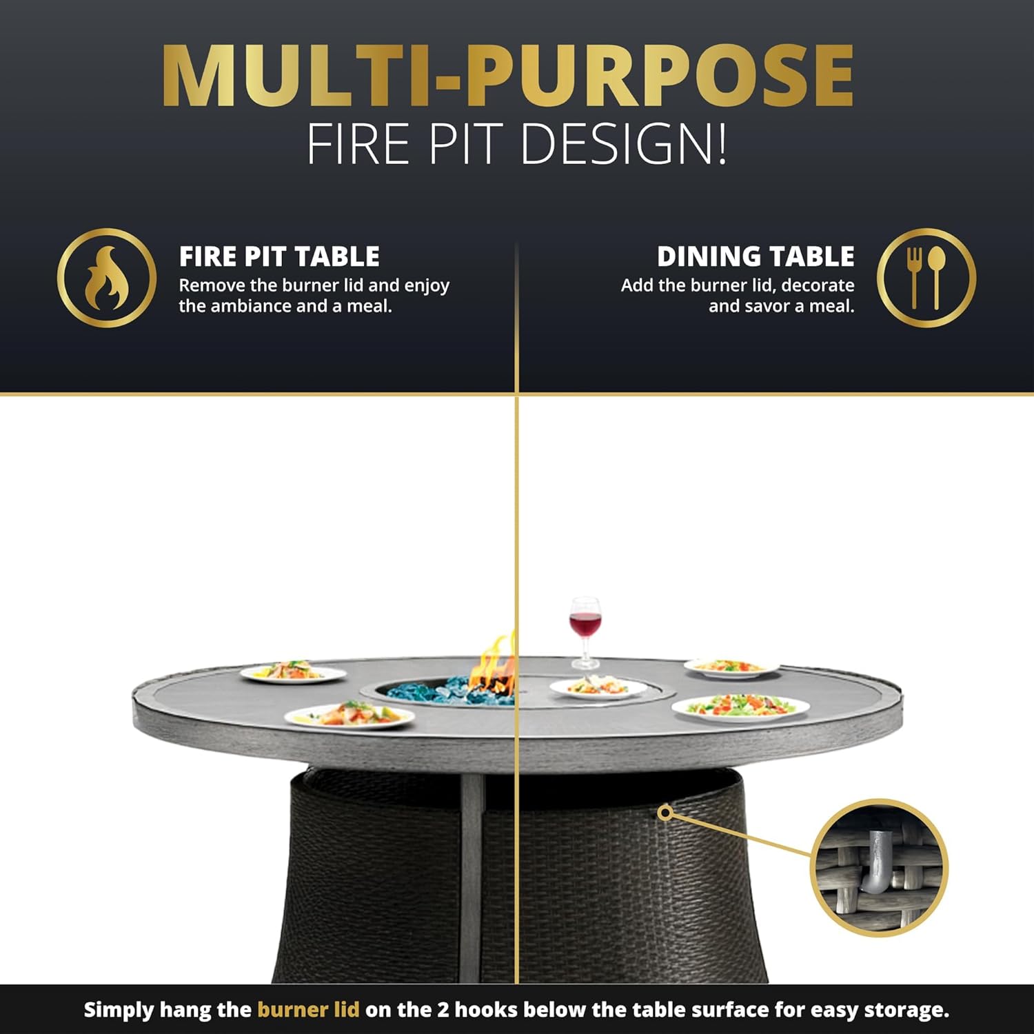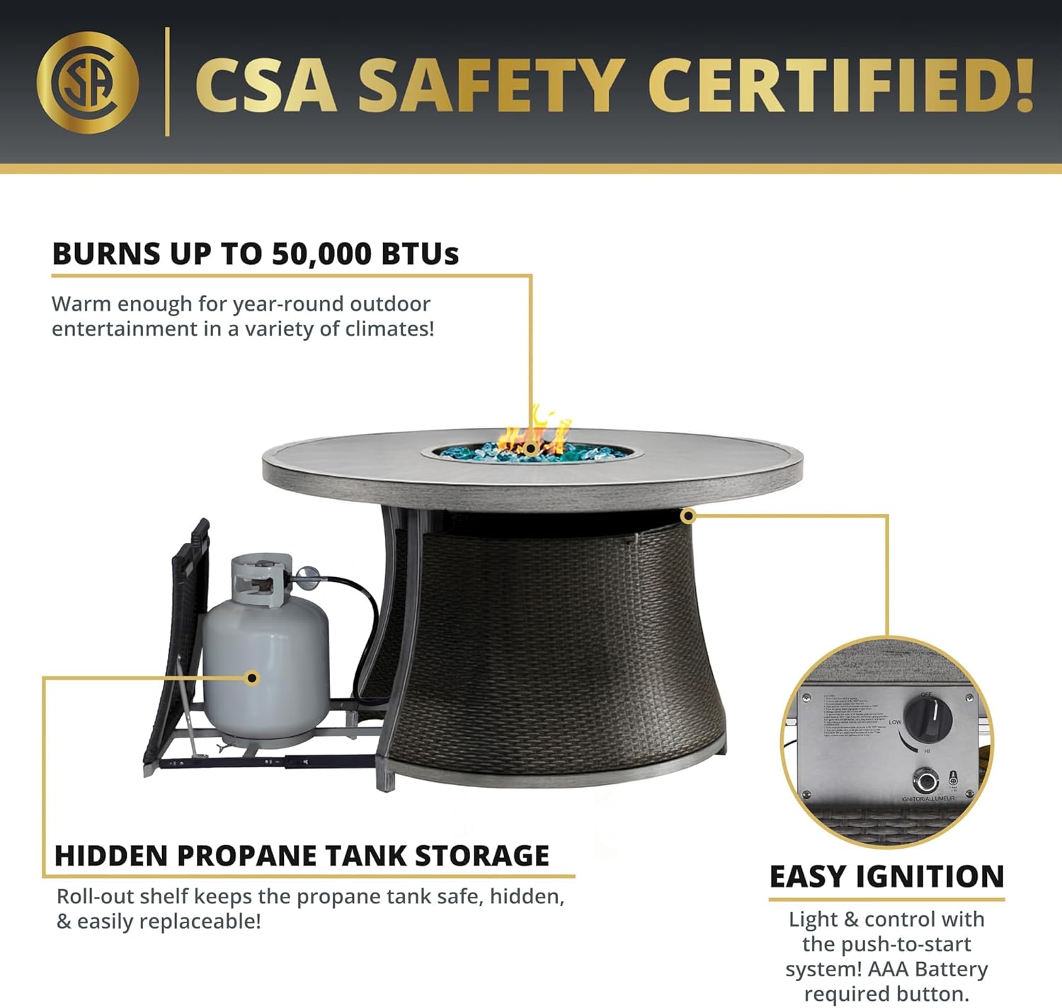 - 【CSA-Certified Safe Heating】Our 50,000 BTU propane fire pit table is CSA-certified for both residential and commercial use, providing smokeless, clean-burning heat. The innovative design includes a hidden pullout propane tank holder that keeps your space tidy, while the push-button ignition system ensures effortless operation. A safer, cleaner alternative to traditional wood-burning fire pits.
