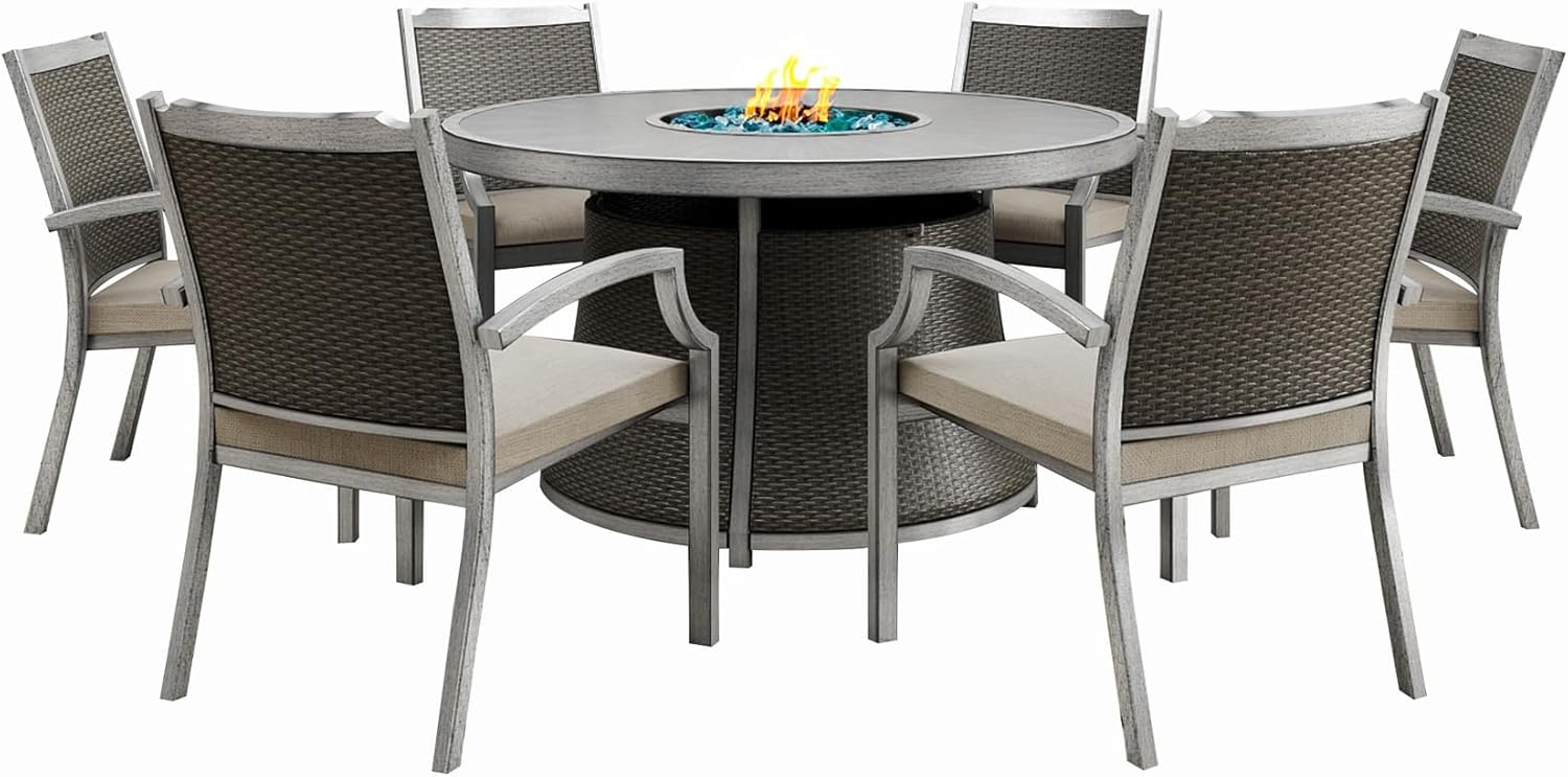 Mazatzal 7 Piece Wicker Patio Furniture Set with 52" Round Propane Gas Firepit Table, 6 Patio Chairs with Cushions, Outdoor Aluminum Conversation Set for Poolside, Backyard, CSA Certified, Gray