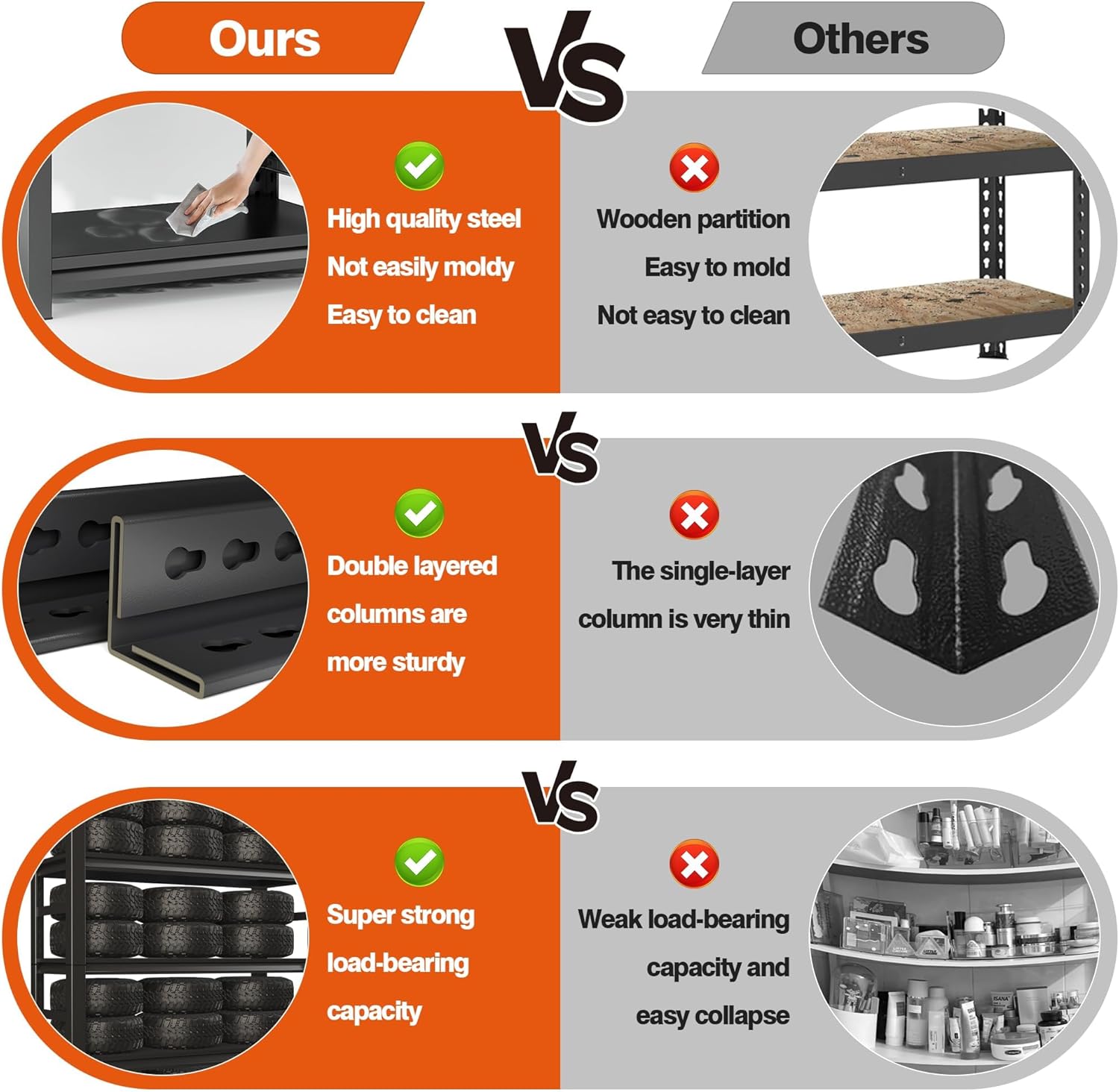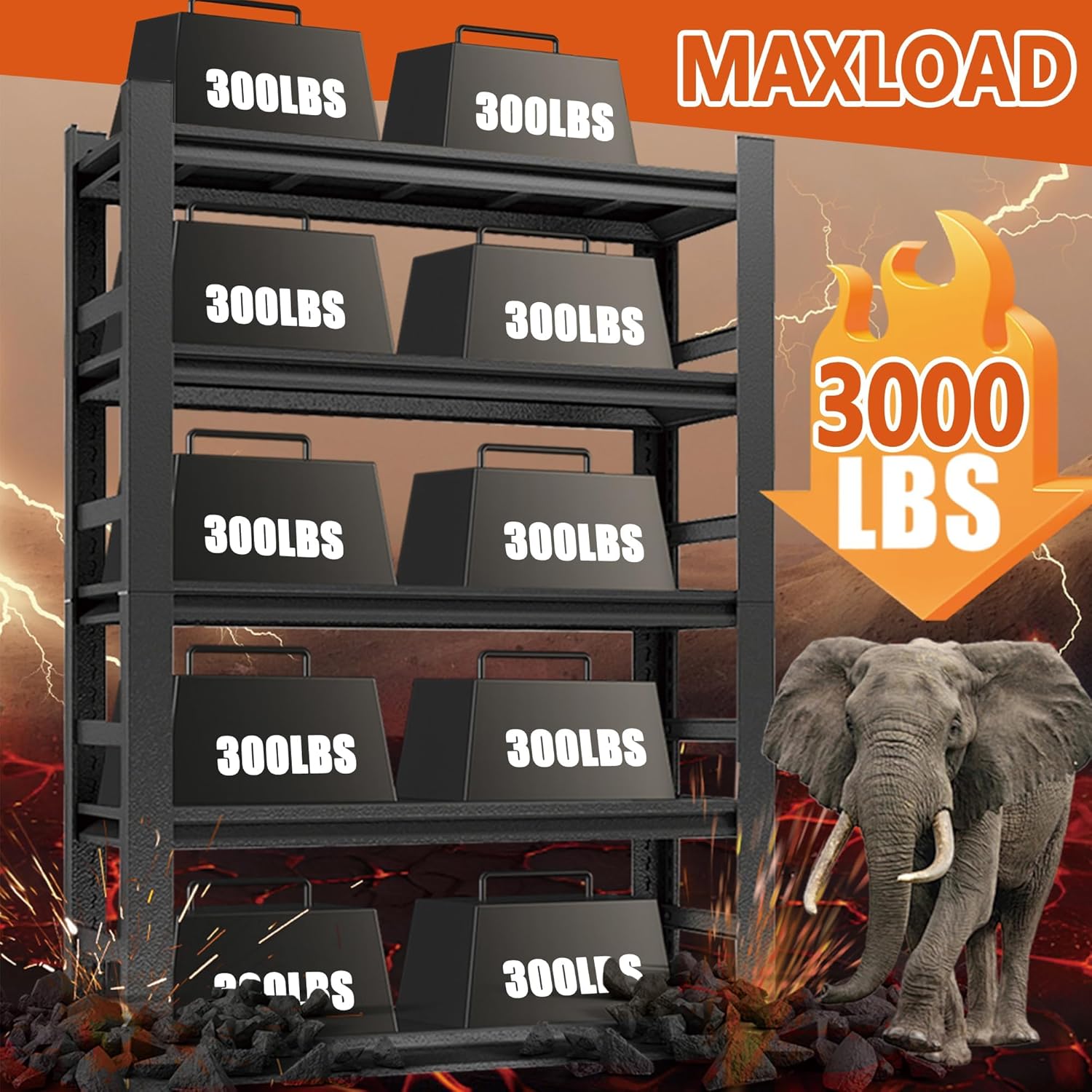 - 【Heavy-Duty 3000lb Garage Shelving】 Our heavy duty garage shelving boasts a 3000lb capacity, reinforced by double-thick steel columns. These industrial shelves provide ultimate durability for garage storage shelves, basement storage shelves, and workshops.