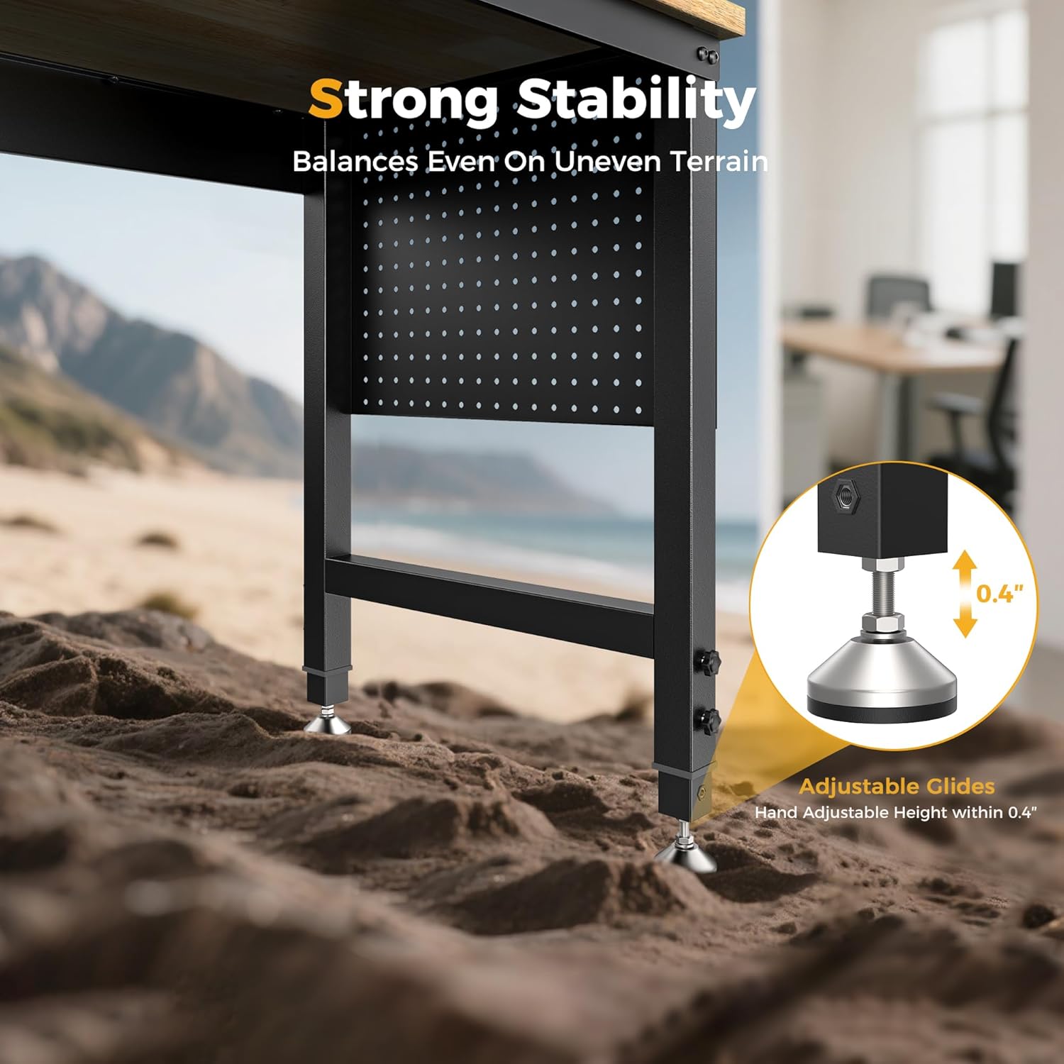 - Multi-level height adjustment: The adjustable workbench has six height settings, and 360° tool-free knobs help us adjust freely, ranging from 28.5" to 39", and no additional tools are required;The adjustable glides are adjustable to accommodate various flooring types. Working while standing or sitting is quite convenient.