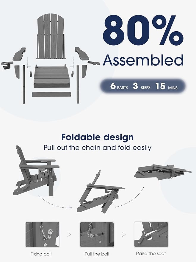 - Quick and Simple Assembly: Enjoy the convenience of a partially pre-assembled chair. Our adirondack chairs comes with 6 parts, clear instructions, and hardware. Assembly requires just 5 steps and 15 minutes.
