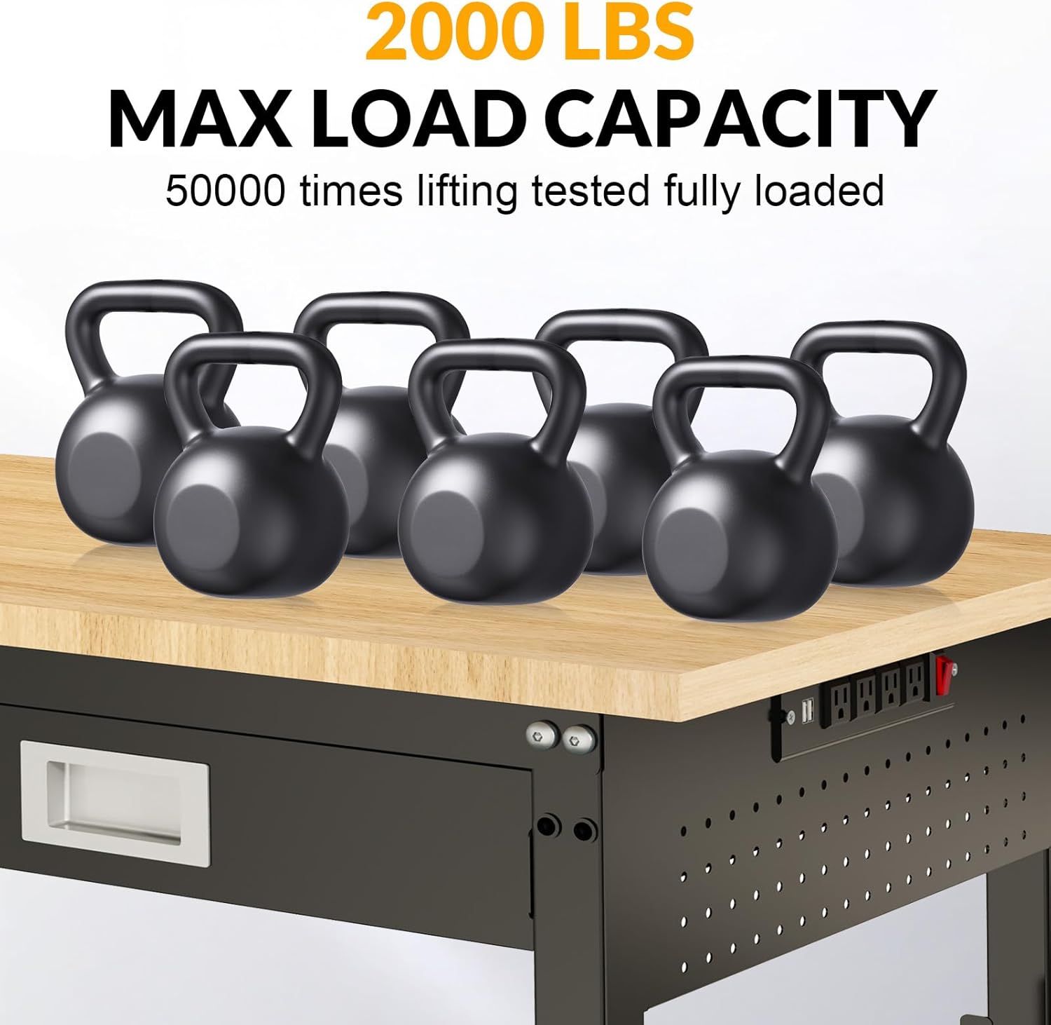 60" Workbench for Garage with Drawers Rubberwood Tabletop Work Table with Pegboard, Power Outlets Adjustable Height Work Bench for Office, Woodworking Shop, Home