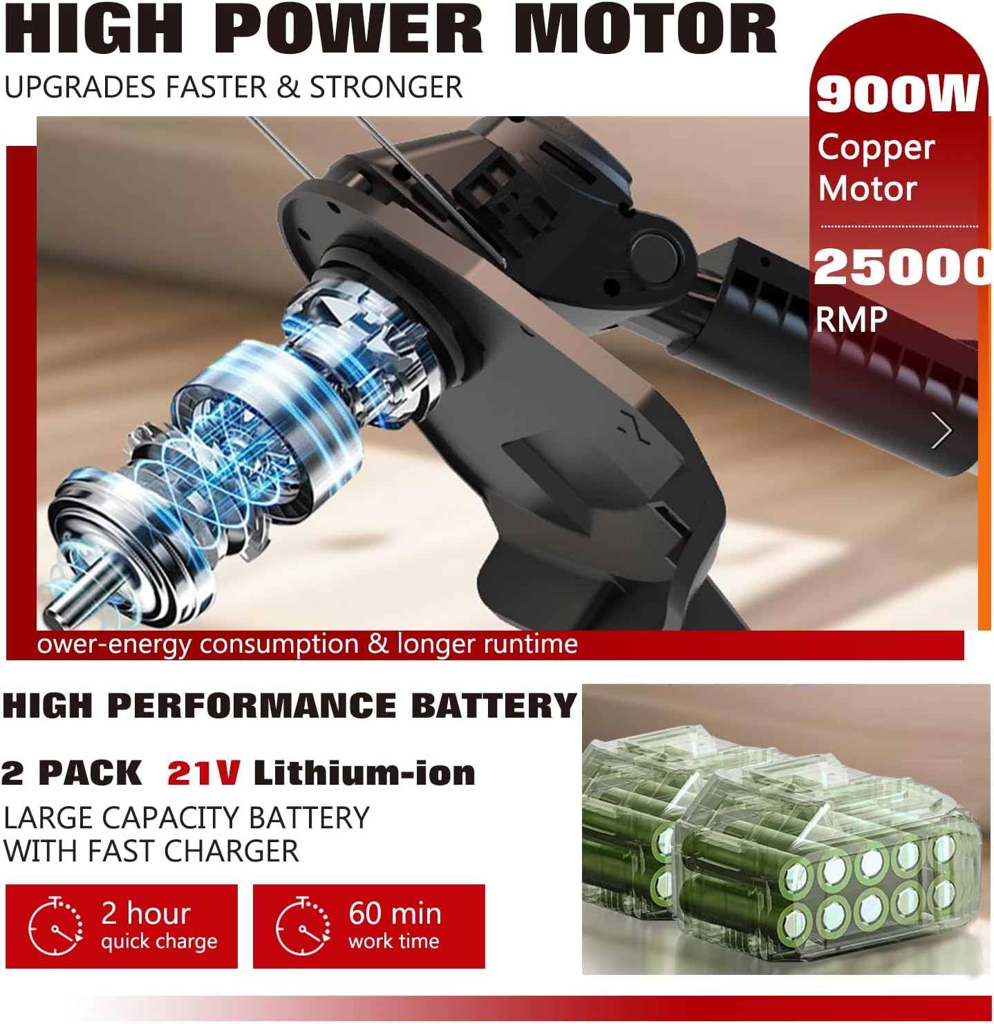 - 【Powerful Electric Weed Wacker Cordless】 The battery powered weed wacker with wheels all in one: grass trimmer/ lawn edger/ small mower/ brush cutter. Not limited by power cord, you can use it anywhere. Includes 2 x 2000mAh high-capacity batteries and a super fast charger. Each battery has a working time of 45-60 minutes and a charging time of 30 minutes. Equipped with 900W high-power pure copper motor with no-load speed up to 20,000RPM. Weeding is easy and you can enjoy the fun of mowing