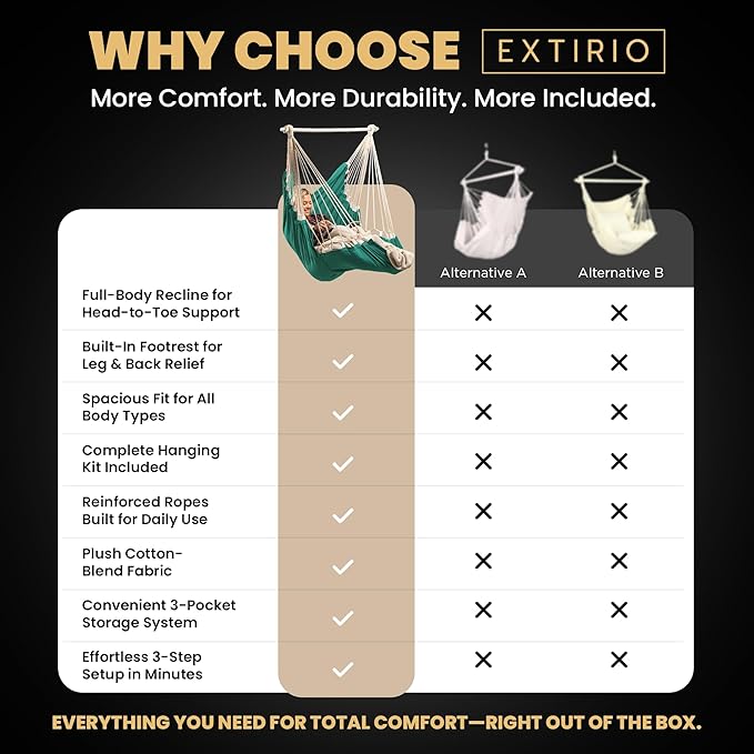 - ๐๐ฉ๐๐๐ข๐จ๐ฎ๐ฌ, ๐ ๐ฎ๐ฅ๐ฅ-๐๐จ๐๐ฒ ๐๐จ๐ฆ๐๐จ๐ซ๐ญ โ Unwind fully in our hammock chair with footrest, made for deep relaxation and full-body support. With a built-in foot rest and breathable cotton blend, itโs the perfect hanging chair for bedroom, patio, or porchโand the ideal indoor swing for adults seeking a cozy reading nook or napping spot.