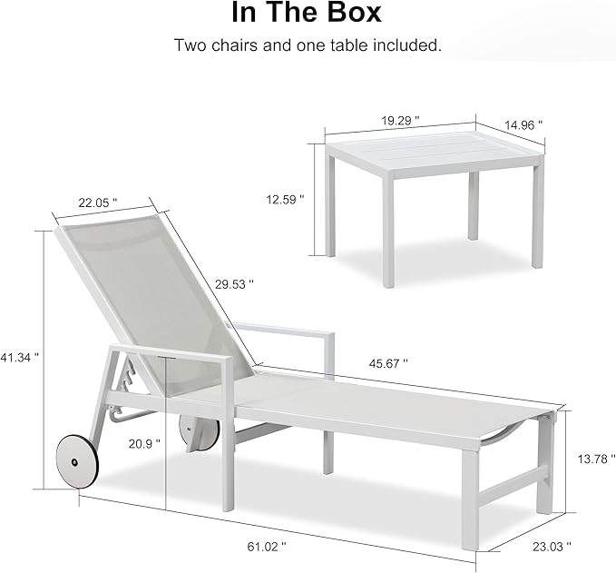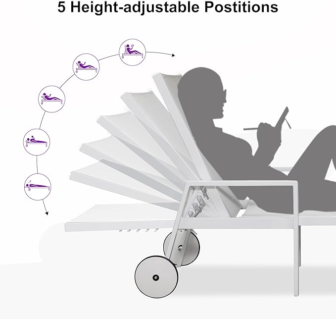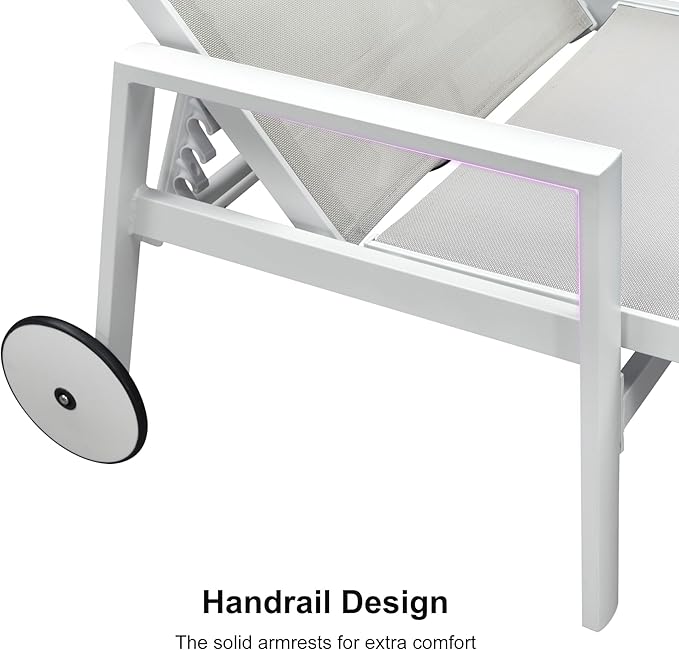 - White Aluminum Frame: This white aluminum alloy chaise lounge with armrests features a corrosion-proof powder coating; effectively protecting against sun exposure; allowing you to enjoy outdoor comfort anytime; anywhere. The aluminum frame also enhances its durability and sturdiness; withstanding a maximum weight of 270 lbs