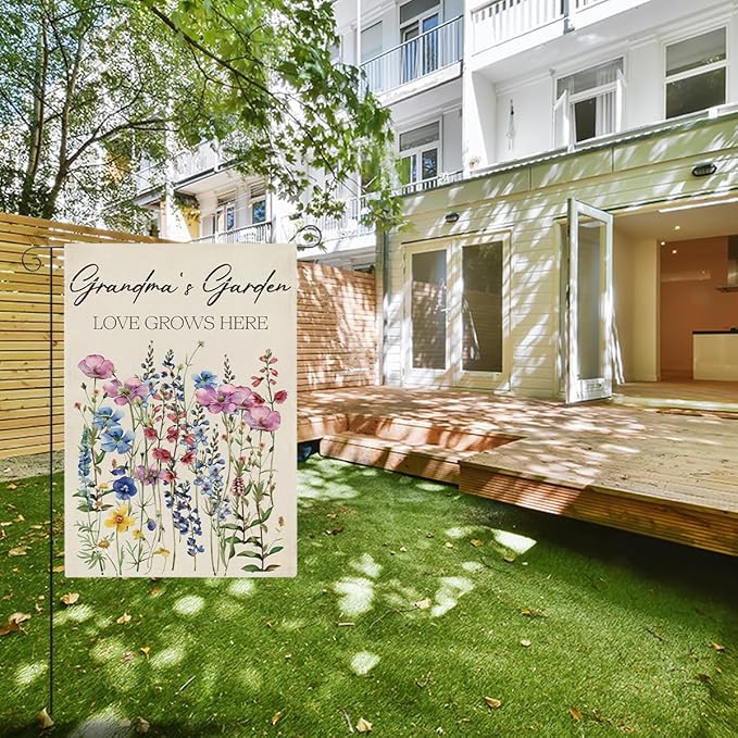 Grandma's Garden Flag Welcome Sign Love Grows Here Flag Gift Flower Decoration Small Double Sided Burlap art Stained Glass Style Garden Flags 12 x 18 Inch for Outside