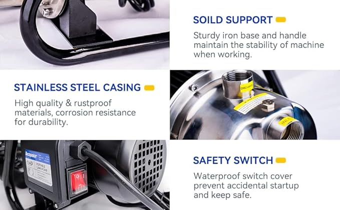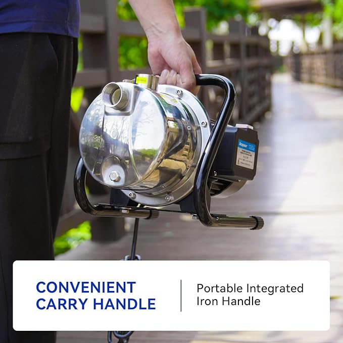 - Portable & Durable Design: The stainless steel casing and aluminum motor housing ensure durability and corrosion resistance. Easy-to-carry Iron handle with lightweight for portability. Waterproof On/Off switch for safety and easy operation. This irrigation pump is designed for lawn, garden, farm with low noise and easy installation