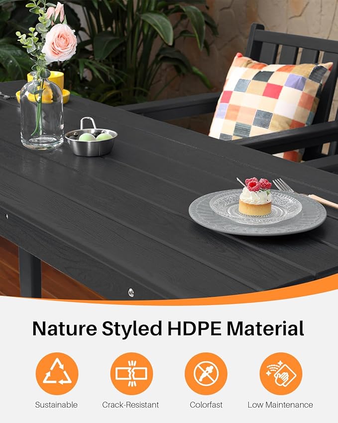 - Low Maintenance with Elegant Obsidian Finish: The HDPE obsidian finish resists fading, peeling, and staining, requiring only simple cleaning with mild soap and water. This low-upkeep patio bar stools and table set combines modern outdoor style with practical durability, supported by SeeHill’s responsive customer service for peace of mind.