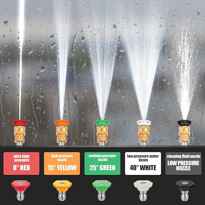 - Versatile Cleaning Options: The pressure washer includes 5 quick-connect nozzles (0º,15º, 25º, 40º, 60º, and soap) to tackle different cleaning tasks, such as porches, driveways, patios, and even vehicles, providing flexibility for various cleaning needs.1L soap tank with adjustable switch-use to spray soaps and detergents.