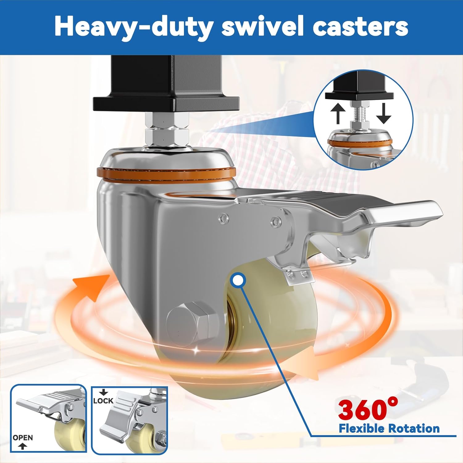 - 360° Lockable Casters for Mobility & Stability. Built for flexibility, the four heavy-duty wheels allow you to move the table effortlessly, then lock securely in place for a rock-solid working experience.