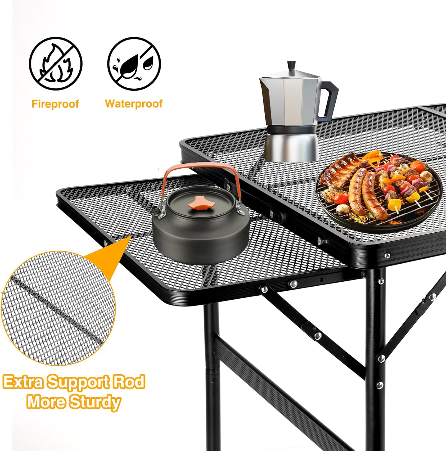 Grill Table 3FT+1.4 FT Folding Table with 2 Wing Panels with Mesh Desktop 2 Height Adjustable Portable Grill for Outdoor Indoor Beach BBQ Picnic Travel RV Black