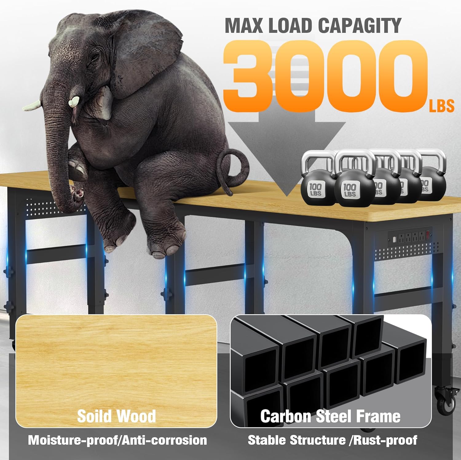 - Heavy-Duty and Durable Construction: The table top of this heavy duty workbench is made of solid wood and finely polished to prevent cracking, the legs and additional support rods are made of reinforced carbon steel with a weight capacity of over 3000 lbs