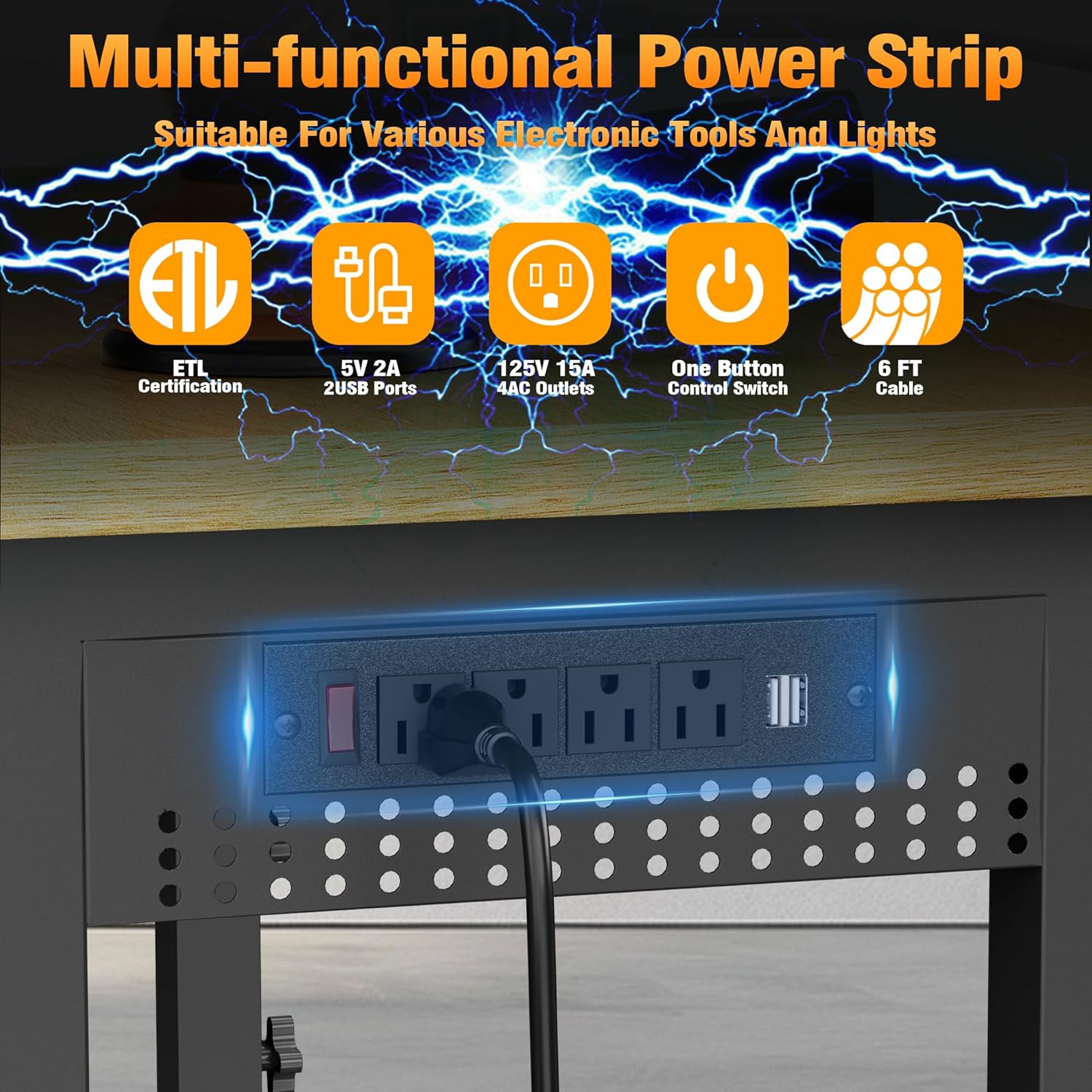 - Built-in Power Outlet & Pegboard: The power strip has 4 AC outlets, 2 USB ports and 1 switch to ensure safety and durability; the built-in pegboard on both sides allows you to organize your tools and accessories efficiently and keep the space tidy