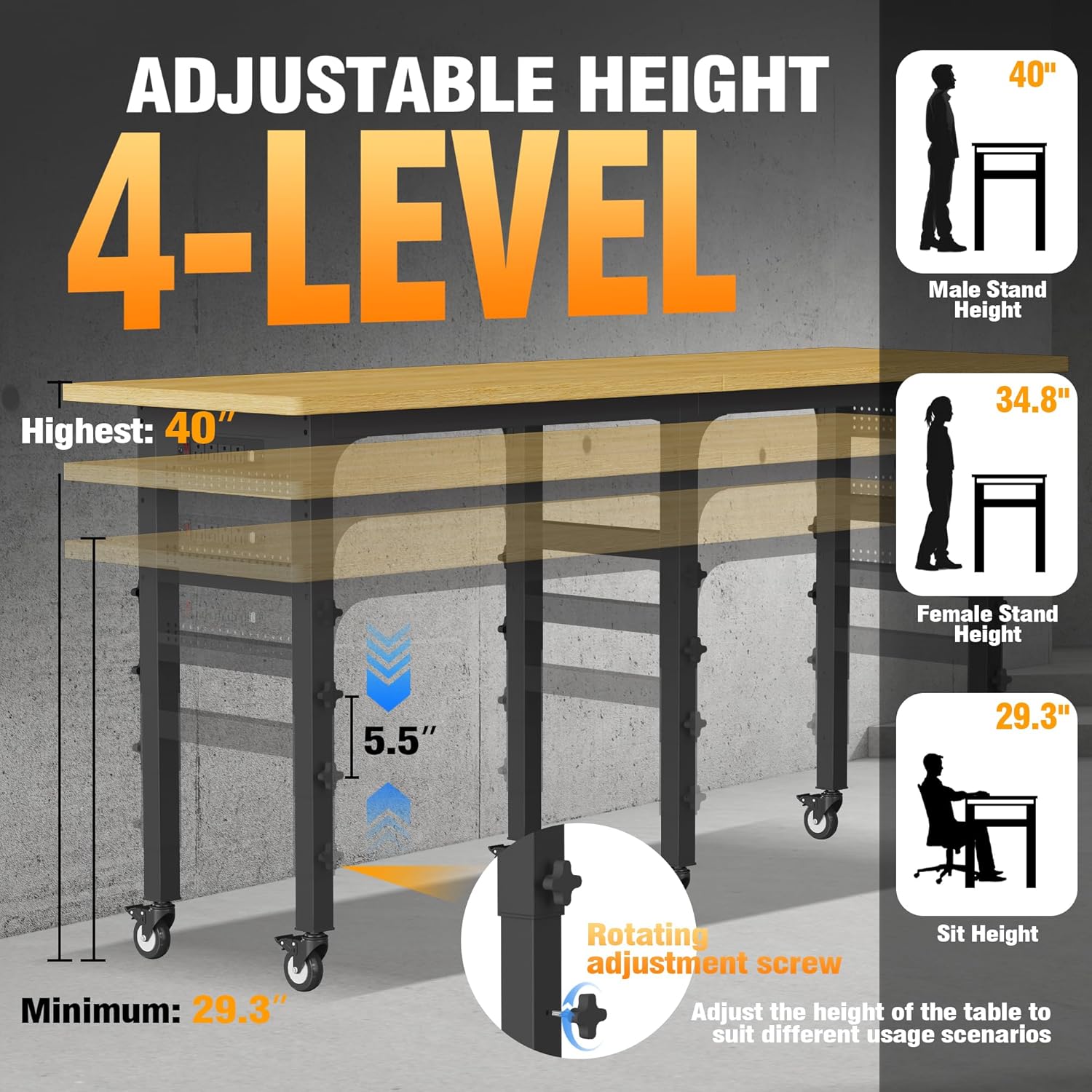 - Multi-Level Height Adjustable: Without additional tools, the workbench can be adjusted to 4 different heights from 29.3" to 40", allowing you to work more comfortably standing or sitting, preventing you from staying in the same position for a long time