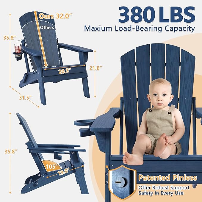 - Durable HDPE Material–Built to Withstand the Elements: Made from high-density polyethylene (HDPE), this Adirondack chair offers superior resistance to weather, fading, and cracking. Unlike wood, it won't rot, peel, or splinter, making it ideal for year-round outdoor use with virtually no maintenance required.